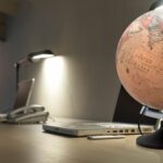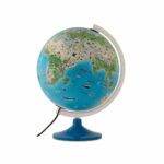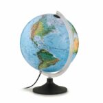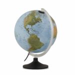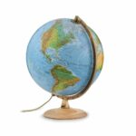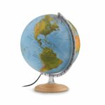 An elegant, illuminated globe featuring up-to-date physical and political cartography. Raised relief map