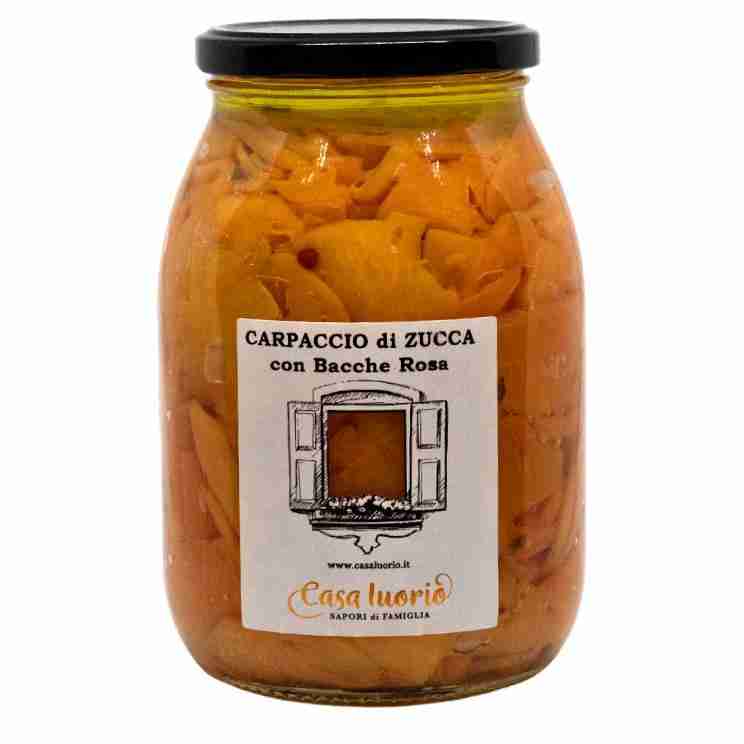 Carpaccio di zucca marinata, con prezzemolo e bacche rosa.