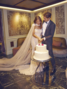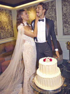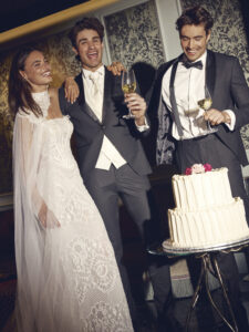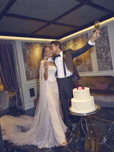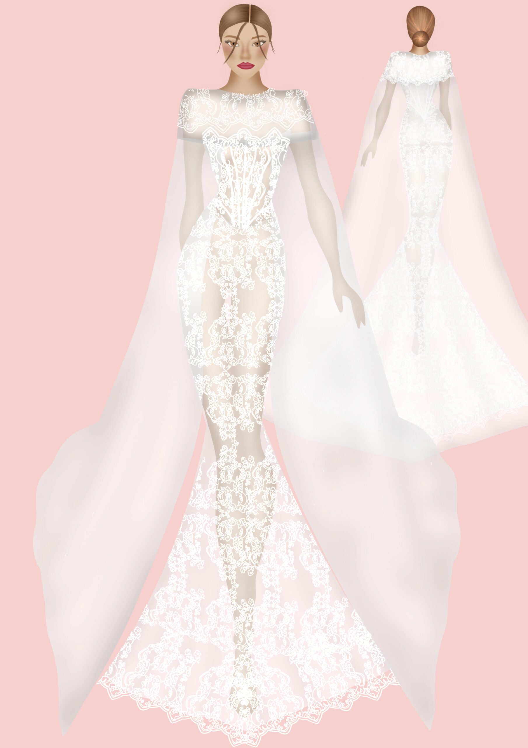 The wedding dress featured in the photo is an extremely refined and luminous mermaid model, perfect for the bride who desires a dramatic and high-impact look. Made of precious embroidered lace with geometric and floral motifs, the dress envelops the silhouette, enhancing feminine forms with elegance and sensuality. Key features: • Adherent mermaid line, which harmoniously follows the curves and gently flares at the bottom, giving a slender and sophisticated effect. • All-over embroidery: the fabric is entirely decorated with precious embroidery and micro-sequins that reflect the light, creating a brilliant and glamorous effect ideal for evening ceremonies or luxury settings. • Short tattoo effect sleeves and boat neckline, which give a contemporary and refined touch, leaving the shoulders delicately uncovered. • Long and voluminous train in very light tulle, which adds theatricality and movement to the dress, perfect for an entrance as a true protagonist. • Sartorial details: refined finishes, strategic transparencies, and artisanal craftsmanship that enhances true Made in Italy. Ideal for the modern bride who dreams of an elegant, exclusive wedding rich in precious details. This dress stands out for its ability to combine tradition and innovation, making it perfect for both civil and religious weddings.