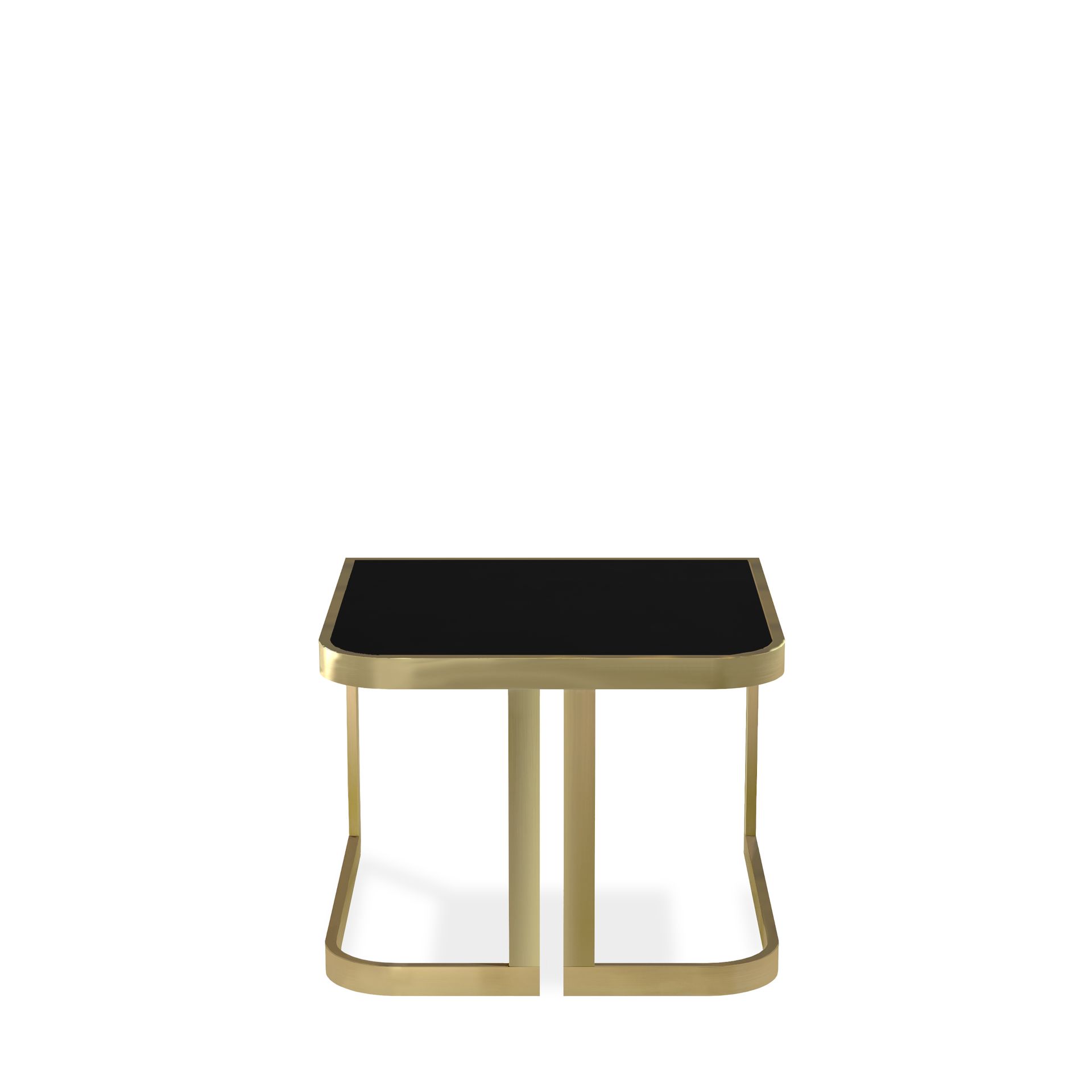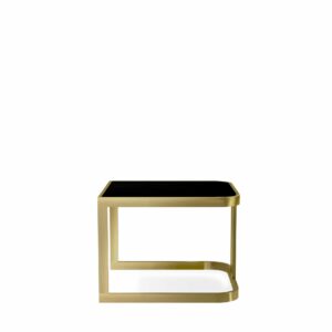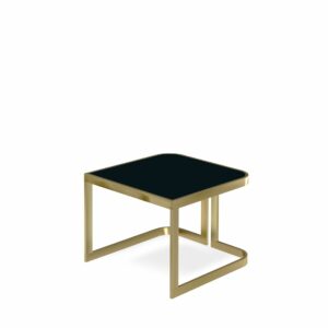 Tavolino lato divano basso Clark con struttura in ottone disponibile con diversi abbinamenti di piani in vetro colorato.