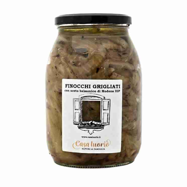 Grigliata di finocchi in aceto balsamico. I finocchi sono coltivati in campo aperto e preparati a mano nella nostra azienda agricola. Ideale come antipasto con salumi e formaggi, come contorno o in un panino gourmet. Una volta aperto il vasetto, mantenere in frigorifero a +5 °C e consumare entro 2 mesi.
