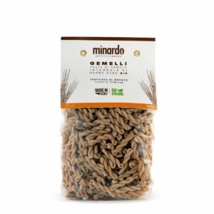 I gemelli, sono un formato che ricorda la busiata, ma che ha il vantaggio di cuocere più velocemente, perfetto per primi veloci e gustosi. Realizzata con solo grano biologico integrale della varietà Timilia, viene trafilata al bronzo ed essiccata lentamente, a basse temperature, per preservare tutte le caratteristiche nutritive. Una lavorazione artigianale, per una pasta d’eccellenza.