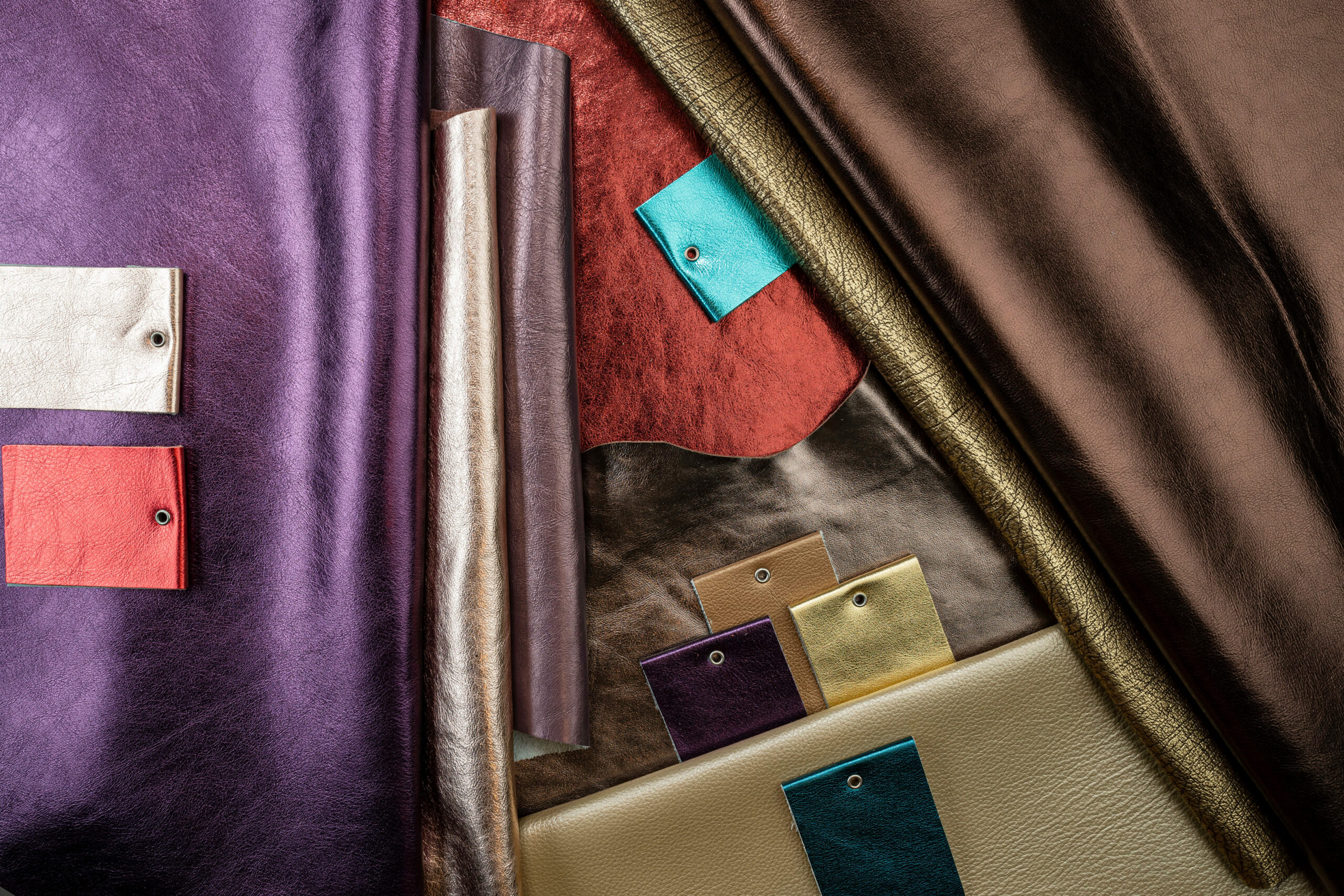Pelle bovina europea, tinta in anilina. Effetto metallico.