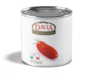 Per la produzione dei pomodori pelati si utilizzano varietà di pomodoro di forma allungata, piriformi. La scatola di pomodori pelati contiene pomodori interi e sbucciati, conservati in succo di pomodoro. La scatola contiene circa 1500 gr. di pomodori interi e 1000 gr. di succo di pomodoro.