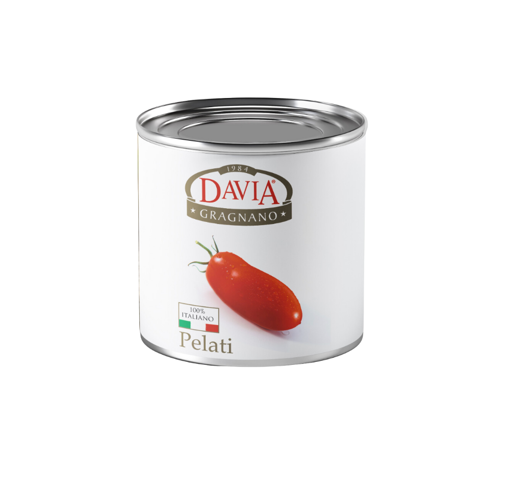 Per la produzione dei pomodori pelati si utilizzano varietà di pomodoro di forma allungata, piriformi. La scatola di pomodori pelati contiene pomodori interi e sbucciati, conservati in succo di pomodoro. La scatola contiene circa 240 gr. di pomodori interi e 160 gr. di succo di pomodoro.