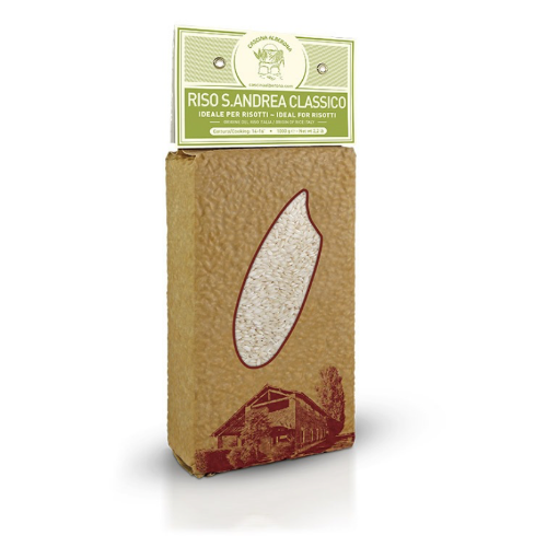 Riso Sant’Andrea Classico presenta chicchi più piccoli rispetto al Carnaroli, affusolati e lunghi con struttura vitrea e compatta.