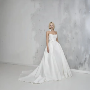 Johanna is a full-length wedding dress that exudes romantic and contemporary elegance. The flowing line of the skirt, enhanced by the overskirt effect, lightly accompanies movement, creating a harmonious and refined silhouette.