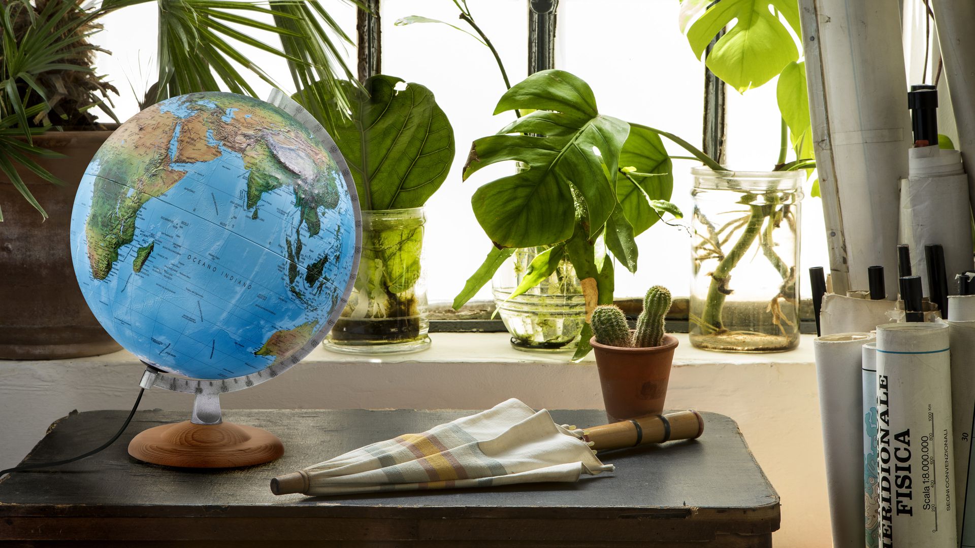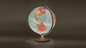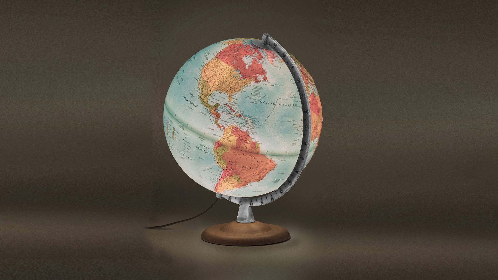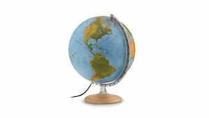 An elegant, illuminated globe featuring up-to-date physical and political cartography. Raised relief map