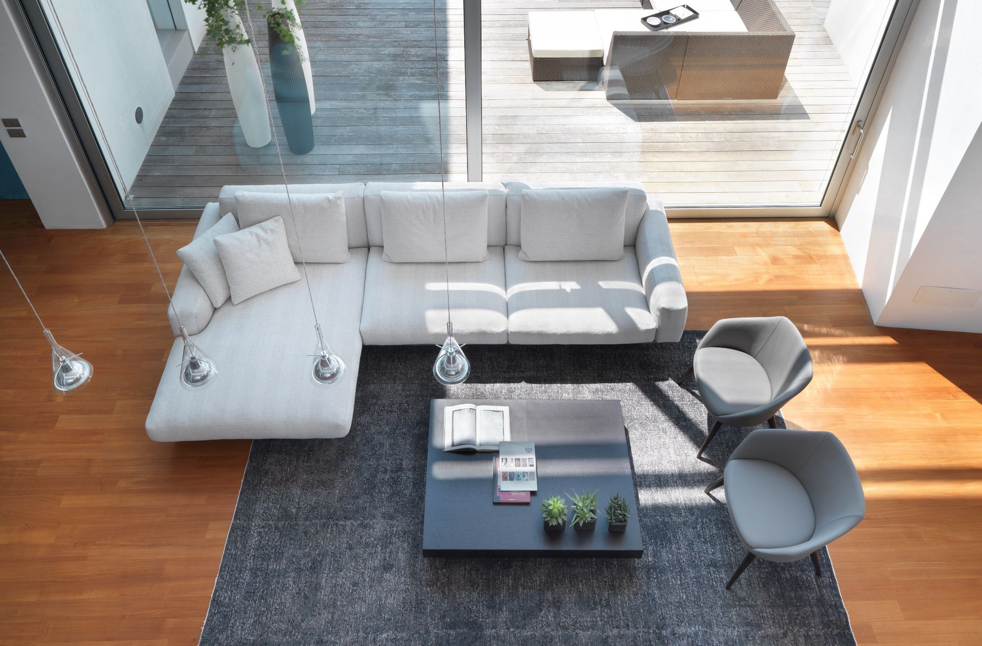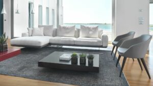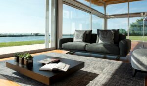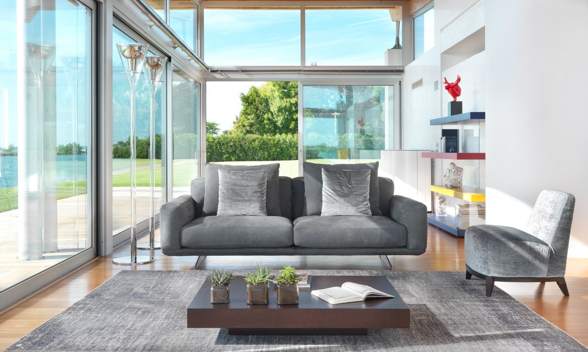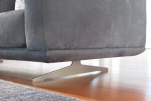 A sofa with contemporary proportions, whose linear forms are enriched and enhanced by stylized details of the structure that keeps it suspended. A harmonious combination which can make the living area a protagonist.